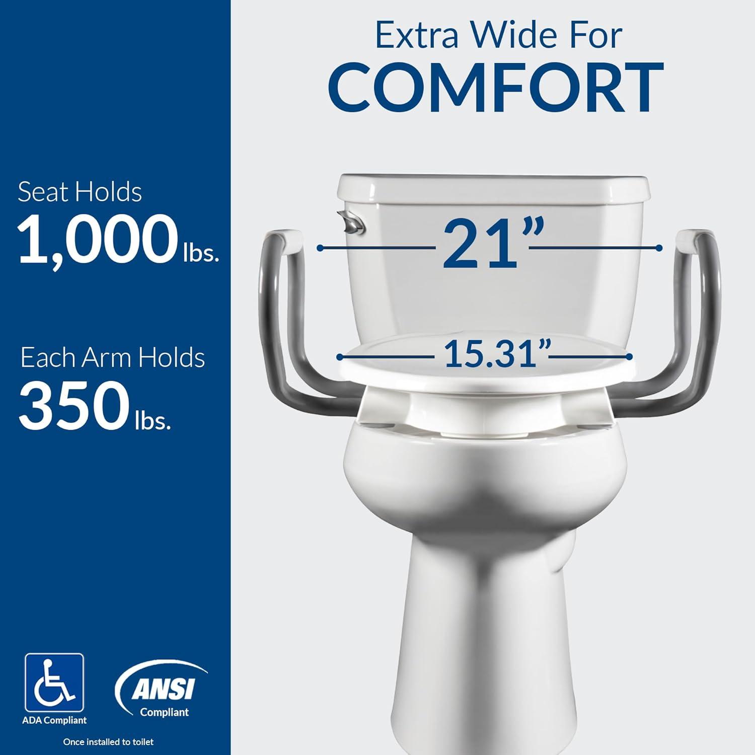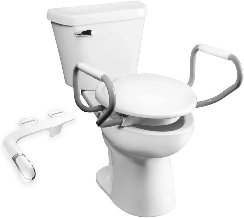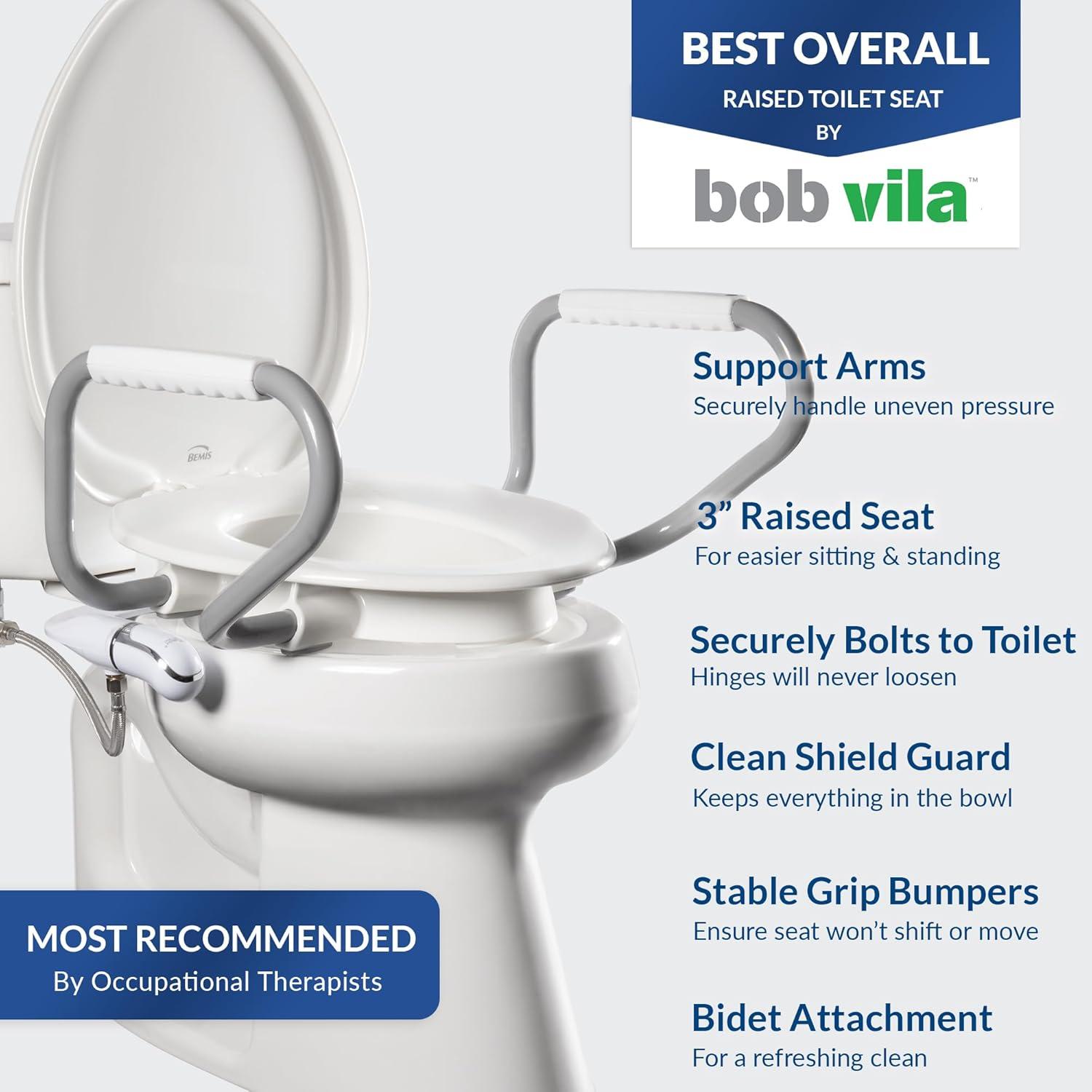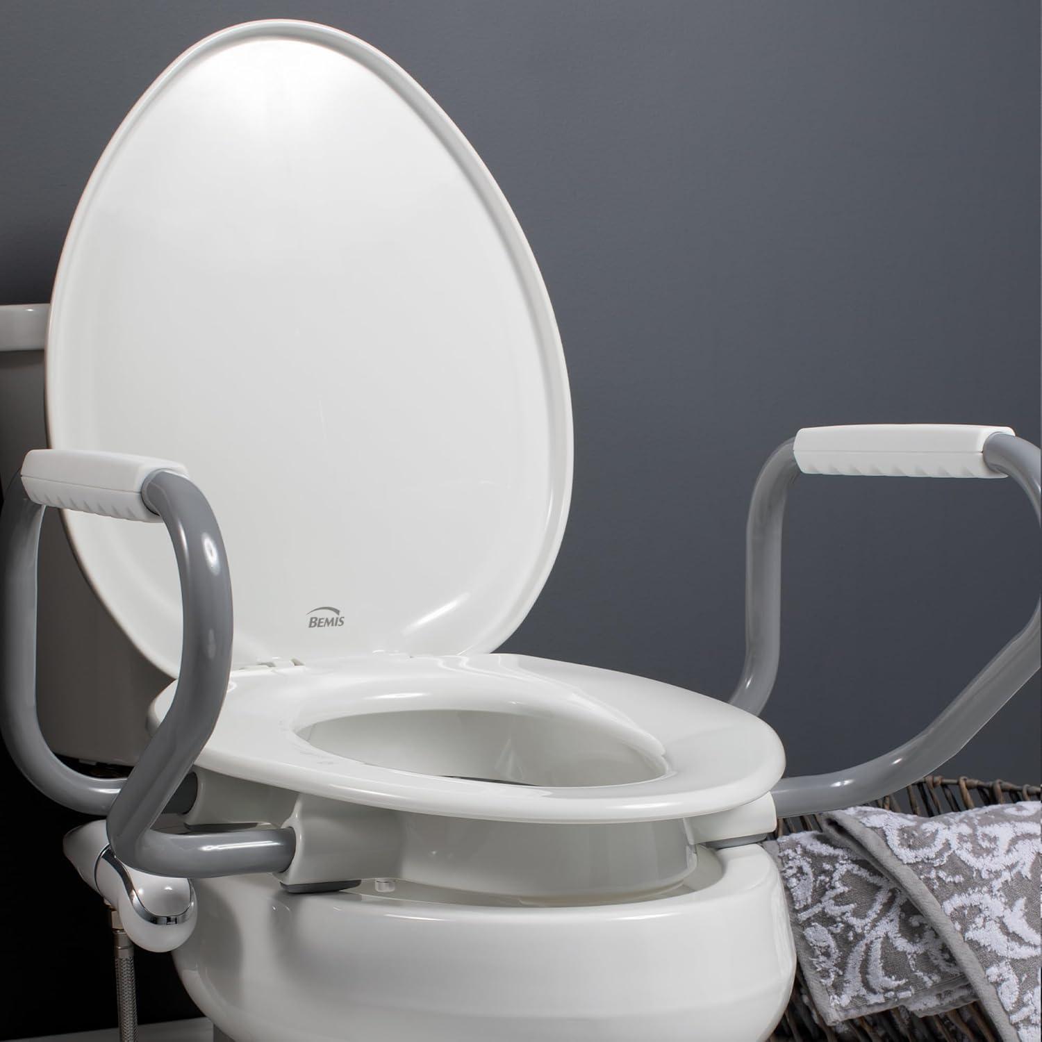 The BEMIS INDEPENDENCE Assurance with Clean Shield Elevated/Raised toilet seat is elevated 3″ to make sitting and standing easier and the heavy duty aluminum support arms provide even more security for users with an ergonomic design and placement of hand grips to better support themselves and body weight. Innovative shield under the ring keeps content in the bowl and is easy to clean unlike other raised toilet seats or risers. Wide, comfortable ring designed to eliminate pressure points has a weight capacity of 1000 lbs. Seat is securely fastened with Snap 2 Secure system (installation tool included) to eliminate concerns about falling. This seat is also equiped with self-sustaining hinges to prevent the seat from slamming down as ell as provide easier access for cleaning. A secure seat is critical to your independence.