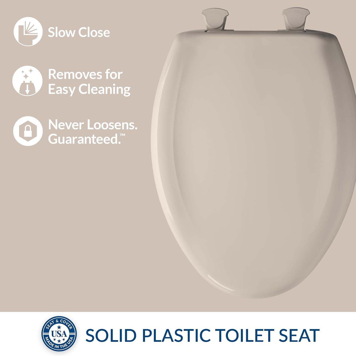 This Bemis Classic Colors plastic toilet seat with molded-in color provides a smooth, easy to clean surface with long lasting color. This durable plastic seat resists chips, wears, and stains. It features slow-close technology with the Whisper Close hinge that, with just a tap, allows the lid to close slowly and quietly with no slamming or pinched fingers. With the innovative STAY-TITE Seat Fastening System, the seat does not shift around and stays firmly attached to the toilet bowl. The color-matched Easy Clean & Change hinges allow you to remove the seat for easy cleaning and replacement. This seat is proudly made in Sheboygan Falls, Wisconsin, USA and fits most manufacturers' ELONGATED bowls in the US and Canada.