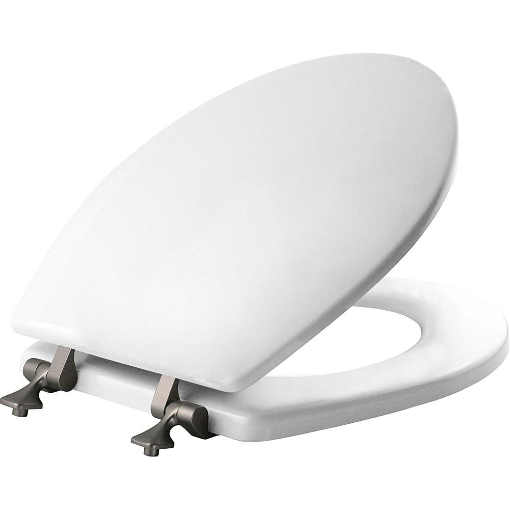 MAYFAIR 1844BNA 000 Toilet Seat with Brushed Nickel Hinges will Never Come Loose, ELONGATE, White – Brushed Nickel